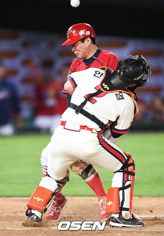 30일 오후 부산 사직구장서 열린 '2015 타이어뱅크 KBO리그' 롯데 자이언츠와 KIA 타이거즈의 경기,6회초 1사 만루 KIA 이범호의 희생플라이때 3루 주자 신종길이 태그업해 안중열 포수와 충돌하고 있다. 득점 인정.