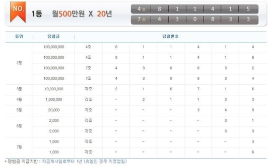 발표 결과, 1등 당첨번호는 4조 811415번과 7조 430833번으로결정됐으며 1등 당첨금은 매달 500만 원씩 20년간 연금 형식으로 지급된다. 세금을 뗀 실수령액은 390만 원 정도다.