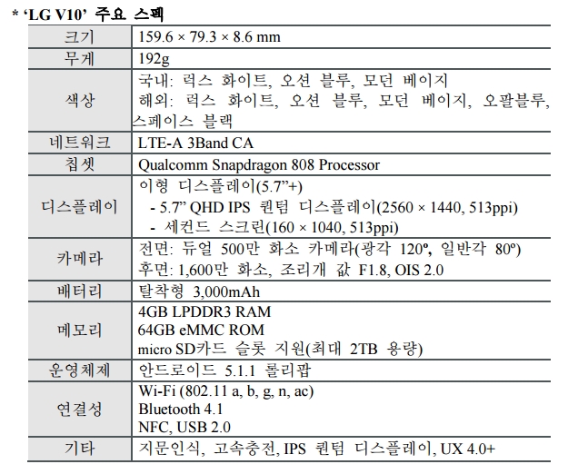 이밖에도 ‘LG V10’은 충격에 강해졌고 32비트 하이파이 DAC(Digital to Analog Convertor)을 내장해 전문 디지털 오디오 성능을 제공한다. 퀄컴의 퀵차지(Quick Charge) 2.0을 지원, 40분 안에 배터리 용량의 50%까지 충전할 수 있다.