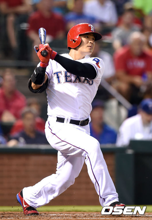 1회말 1사 텍사스 추신수가 안타를 때리고 있다.
