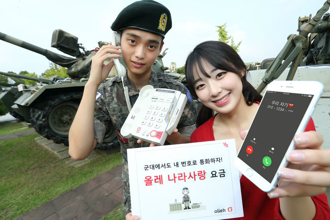 KT(회장 황창규, www.kt.com)는 국내 최초로 군 복무 중인 병사가 부대 내 군 전용전화, 공중전화로 걸어도 본인의 휴대폰 번호를 표시해 주고, 매월 무료통화, 휴가 데이터를 제공하는 '올레 나라사랑 요금제'를 1일 출시했다.