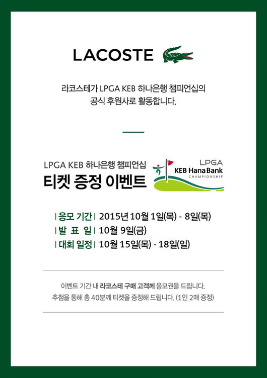 ㈜ 동일드방레(대표 이선효)가 전개하는 프랑스 프리미엄 캐주얼 브랜드 ‘라코스테(LACOSTE)’가 ‘LPGA KEB 하나은행 챔피언십’의 공식 후원을 기념해 특별 프로모션을 펼친다.