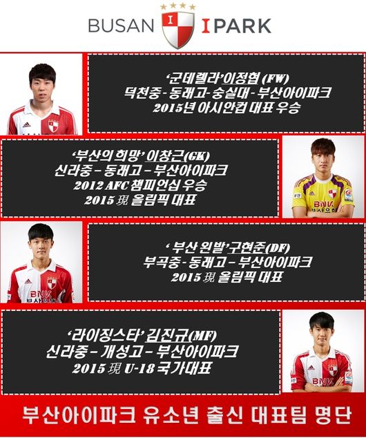 유소년 시스템에 꾸준히 투자를 이어온 부산의 성과는 둘에 그치지 않았다. 성인대표팀에서 ‘군데렐라 신드롬’을 일으킨 이정협을 필두로 올 시즌 K리그 클래식 최연소 골을 기록한 팀의 막내 김진규 역시 U-18 대표팀으로 태극마크를 달며 각 연령대별 대표팀에 부산 출신 유소년들이 포진하고 있다.