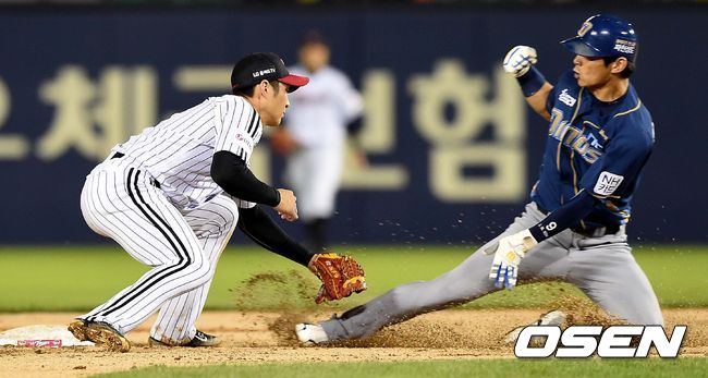 4회초 NC 공격 무사 1루 상황 김종호가 투수 견제에 걸려 2루로 뛰다 LG 유격수 오지환의 태그에 걸려 아웃되고 있다.