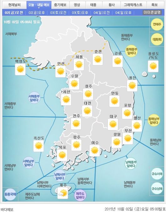 10월 2일 오전 현재 전국이 맑은 날씨를 보이고 있으나, 해안지역은 바람이 강하게 불고 있고, 그 밖의 지역에도 약간 강하게 부는 곳이 있다. 오늘은 상해 부근에 위치한 고기압의 영향으로 전국이 맑겠다.
