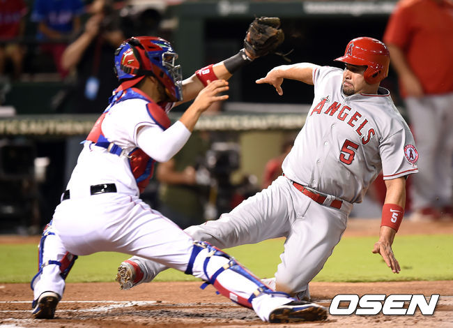 2회초 1사 1,3루 에인절스 푸홀스가 빅토리노의 좌익수 희생플라이때 득점을 올리고 있다.