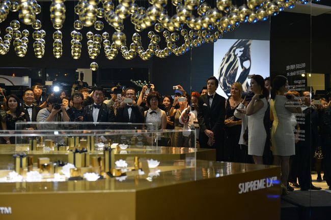 [사진] 제20회 부산국제영화제의 다이아몬드 프리미어 스폰서인 아티스트리가 해운대 BIFF 파빌리온 빌리지에 프레스티지 스킨케어 신제품 '수프림 LX'를 모티브로 한 브랜드 부스를 공개했다.(위) 아티스트리가 해운대 BIFF 빌리지에 설치된 아티스트리 브랜드 부스에서 프레스티지 스킨케어 신제품 '수프림 LX'를 형상화한 '아티스트리 키네틱 아트 퍼포먼스'를 선보이고 있다. / 아티스트리 제공