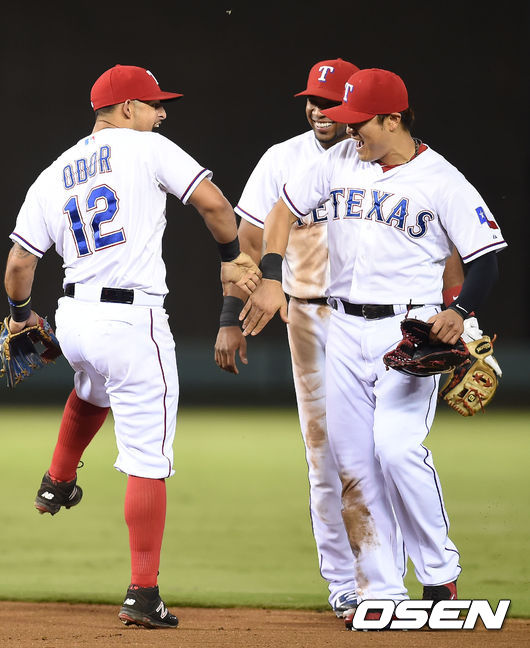 승리를 거둔 텍사스 추신수가 동료들과 기뻐하고 있다./ youngrae@osen.co.kr