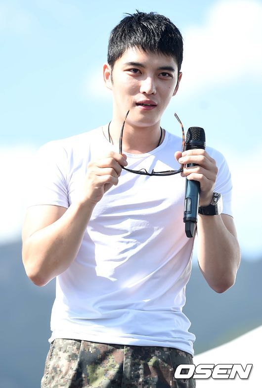 그룹 JYJ 김재중이 공연 중 팬들과 관람객들에게 선글라스를 벗고 인사하고 있다.