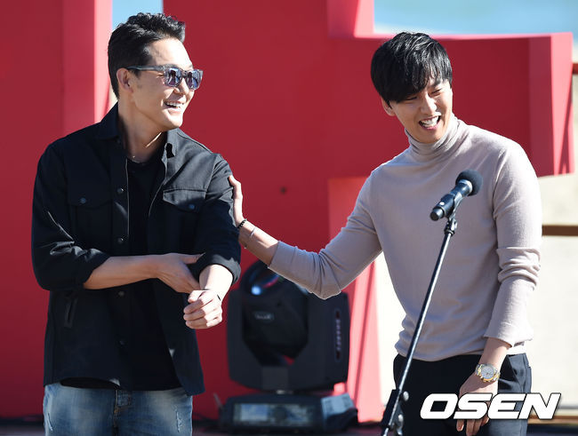 1일 오후 부산 해운대 비프빌리지 야외무대에서 진행된 영화 '무뢰한' 무대인사에서 박성웅 김남길이 미소짓고 있다.