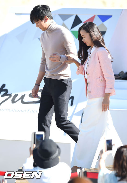 1일 오후 부산 해운대 비프빌리지 야외무대에서 진행된 영화 '무뢰한' 무대인사를 마친 김남길이 전도연을 에스코트 하고 있다.