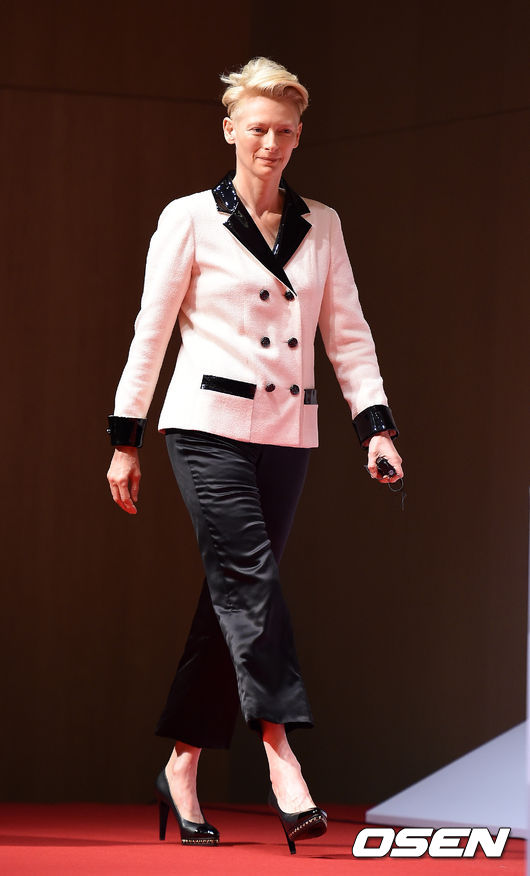 틸다 스윈튼이 입장하고 있다.
