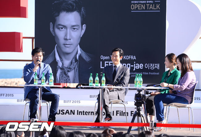 1일 오후 부산 해운대 비프빌리지 야외무대에서 진행된 '이정재 오픈토크'에서 이정재가 진행자와 이야기를 나누고 있다.