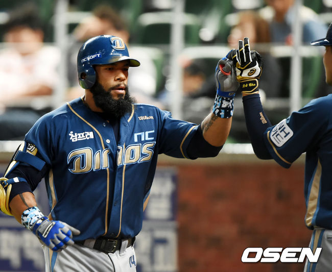 2일 오후 인천 SK행복드림구장에서 열린 '2015 타이어뱅크 KBO 리그' SK 와이번스와 NC 다이노스의 경기, 1회초 1사 주자 1,2루 NC 테임즈가 중월 선취 스리런 홈런을 날린 후 홈을 밟고 있다.