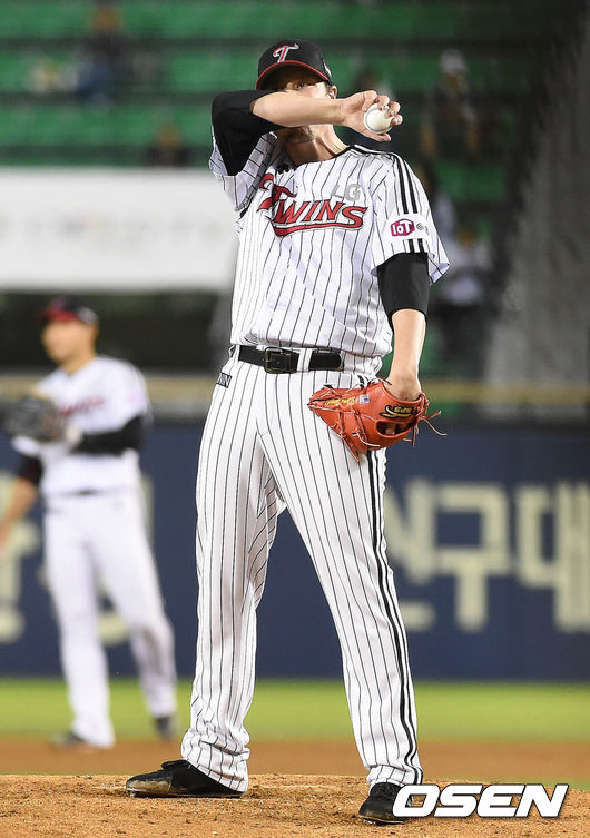 2일 오후 서울 잠실구장에서 열린 '2015 타이어뱅크 KBO 리그' LG 트윈스와 한화 이글스의 경기 1회초 1사 만루 루카스가 마운드에 서 있다.