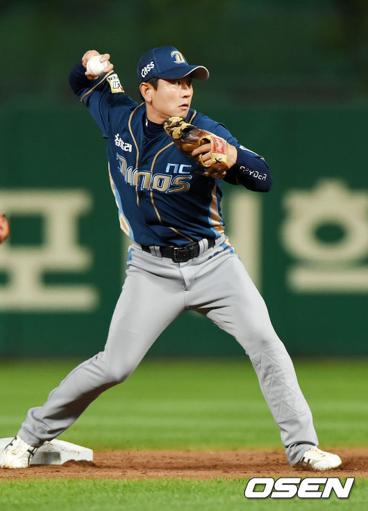 2일 오후 인천 SK행복드림구장에서 열린 '2015 타이어뱅크 KBO 리그' SK 와이번스와 NC 다이노스의 경기, 1회말 무사 주자 1루 SK 박재상의 투수 병살타때 NC 유격수 손시헌이 2루에서 조동화를 포스아웃 시킨 후 1루로 송구하고 있다.