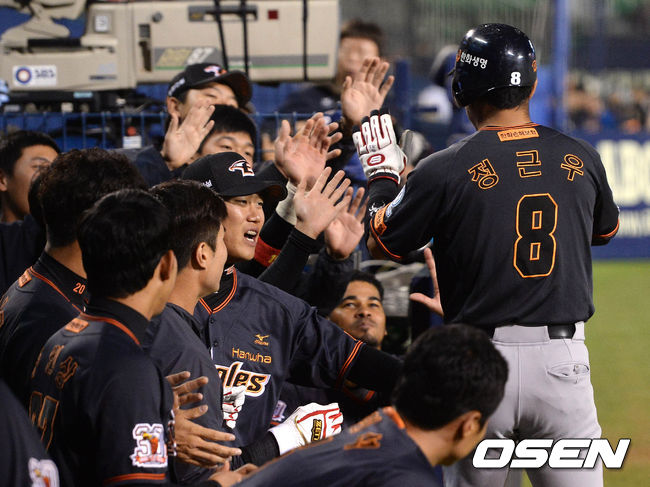 2일 오후 서울 잠실구장에서 열린 '2015 타이어뱅크 KBO 리그' LG 트윈스와 한화 이글스의 경기 1회초 1사 만루 폭스 타석, 밀어내기 사구로 3루주자 정근우가 득점하고 덕아웃에서 동료들과 하이파이브를 하고 있다.