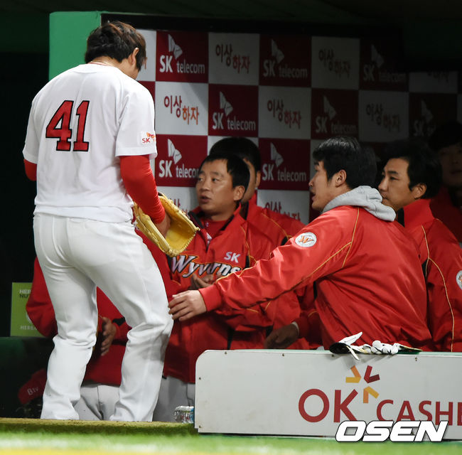 2일 오후 인천 SK행복드림구장에서 열린 '2015 타이어뱅크 KBO 리그' SK 와이번스와 NC 다이노스의 경기, SK 선발 문광은이 2회말 1사 주자 2,3루 김종호 타석에서 강판당하고 있다.