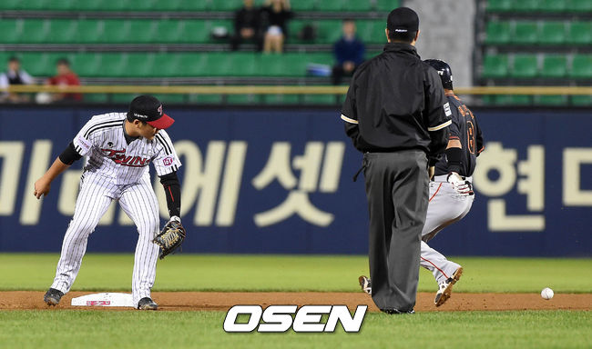 2일 오후 서울 잠실구장에서 열린 '2015 타이어뱅크 KBO 리그' LG 트윈스와 한화 이글스의 경기 1회초 1사 1루 최진행의 내야땅볼 상황, 3루수 히메네스의 송구를 2루수 박지규가 놓치고 있다.