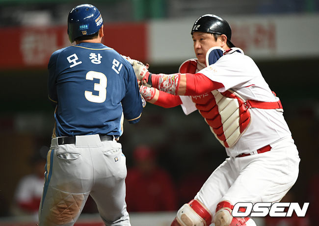 2일 오후 인천 SK행복드림구장에서 열린 '2015 타이어뱅크 KBO 리그' SK 와이번스와 NC 다이노스의 경기, 2회초 1사 주자 2,3루 NC 김종호가 스퀴즈 번트때 3루 주자 모창민이 홈에서 SK 정상호에게 태그아웃을 당하고 있다.