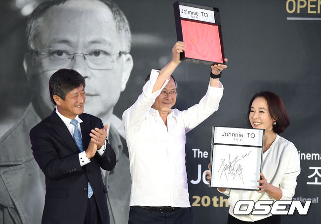 1일 오후 부산 해운대 비프빌리지 야외무대에서 진행된 영화감독 '조니 토 Johnnie To' 핸드프린팅&오픈토크에서 조니 토 감독이 이용관 강수연 집행위원장과 함께 포토타임을 하고 있다.