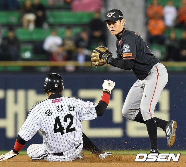 2일 오후 서울 잠실구장에서 열린 '2015 타이어뱅크 KBO 리그' LG 트윈스와 한화 이글스의 경기 3회말 1사 1루 임훈의 땅볼을 강경학이 2루에서 유강남을 포스아웃 시키고 있다.