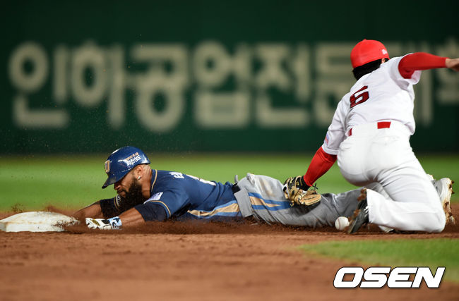 2일 오후 인천 SK행복드림구장에서 열린 '2015 타이어뱅크 KBO 리그' SK 와이번스와 NC 다이노스의 경기, 3회초 무사 주자 1루 NC 나성범 타석에서 1루 주자 테임즈가 2루 도루에 성공하며 40-40에 성공하고 있다.