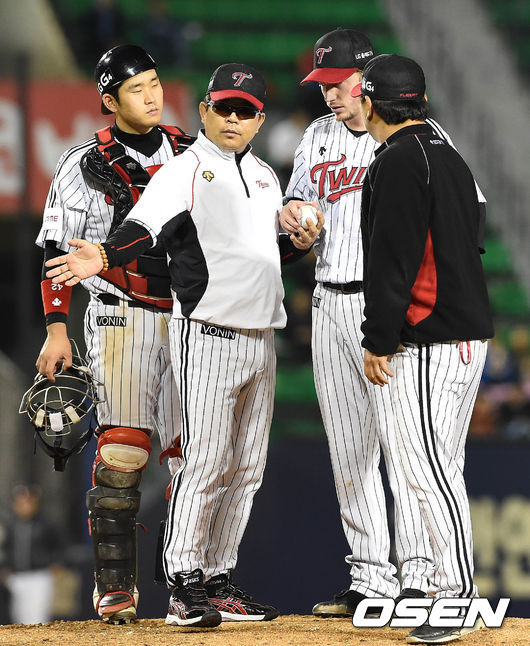 2일 오후 서울 잠실구장에서 열린 '2015 타이어뱅크 KBO 리그' LG 트윈스와 한화 이글스의 경기 6회초 2사 1,3루 양상문 감독이 투수교체 지시를 하고 있다.
