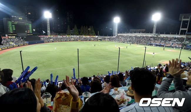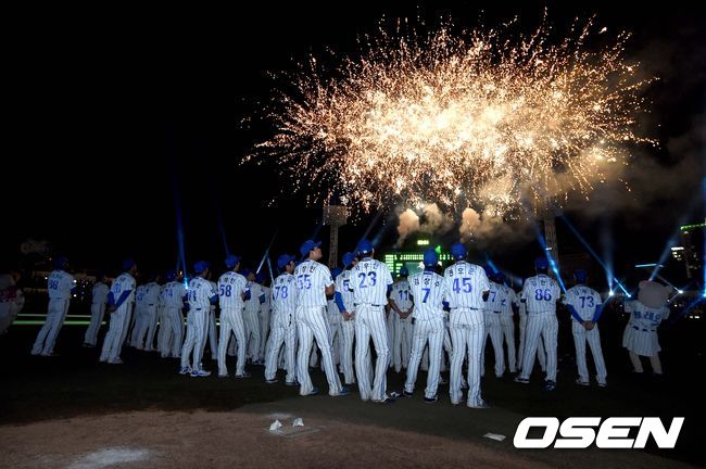 이날로 삼성은 1982년부터 34년간 대구구장에서 정규시즌 통산 2066경기를 치러 1192승835패39무, 승률 5할8푼8리로 끝마쳤다. 경기가 끝난 뒤 조명탑이 꺼진 가운데 선수들과 레전드 모두 그라운드로 나와 굿바이 이벤트로 대형 비행기가 들어왔다. 대구구장의 역사를 담은 영상물이 전광판에 흘러나온 뒤 이어 삼성의 대구구장 홈경기 승수를 의미하는 1192발의 폭죽이 밤하늘을 화려하게 수놓았다. 삼성 선수들과 레전드들도 대구구장과 이별이 아쉬운 듯 1192발의 승리 폭죽을 지켜보며 마지막까지 함께 했다. /waw@osen.co.kr