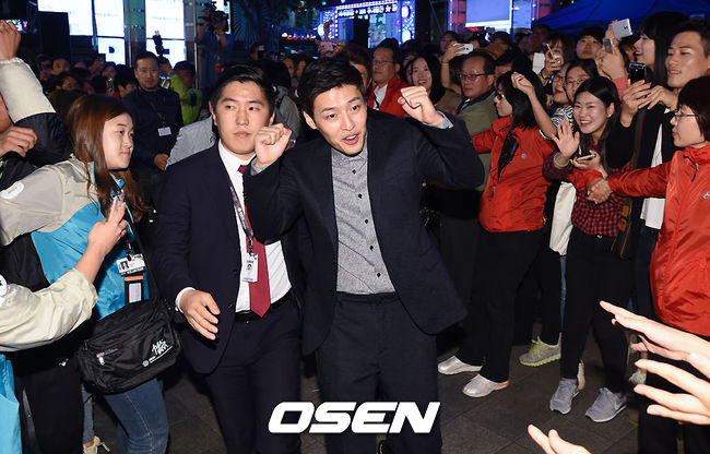 2일 오후 부산 남포동 BIFF광장 야외무대서 열린 영화 '스물' 무대인사에서 배우 강하늘이 퇴장하고 있다.