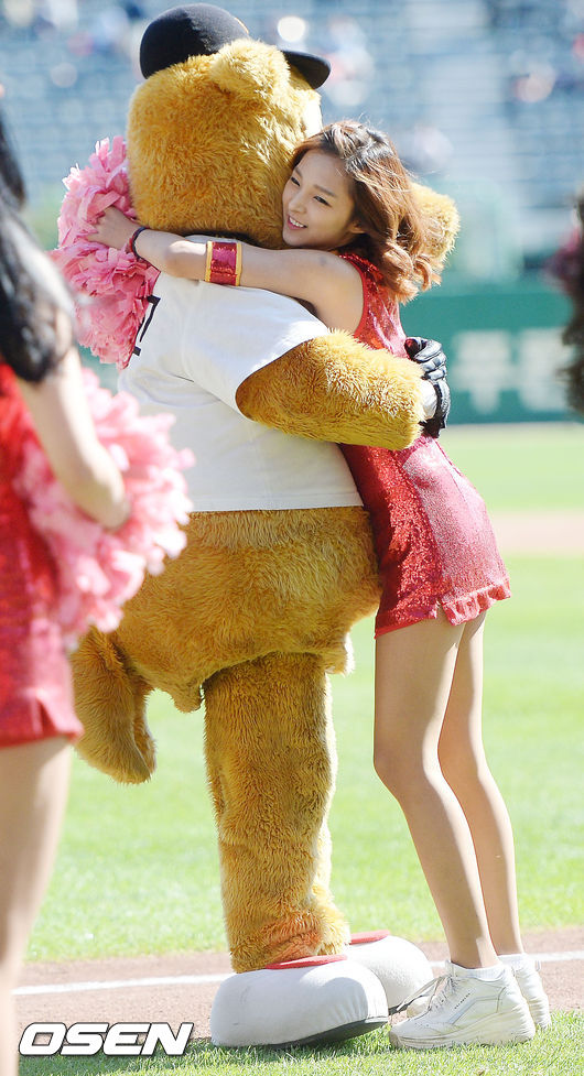 3일 오후 인천 SK행복드림구장에서 '2015 타이어뱅크 KBO 리그' SK 와이번스가 NC 다이노스와의 경기가 열릴 예정인 가운데 그라운드 위에서 SK 치어리더 강윤이가 SK 마스코트 윙고와 포옹을 하고 있다.
