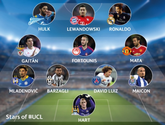 공격수로는 디나모 자그레브전서 해트트릭을 달성한 로베르트 레반도프스키(바이에른 뮌헨)를 비롯해 레알 선수 최다골 타이 기록을 세운 호날두와 헐크(제니트)가 이름을 올렸다.