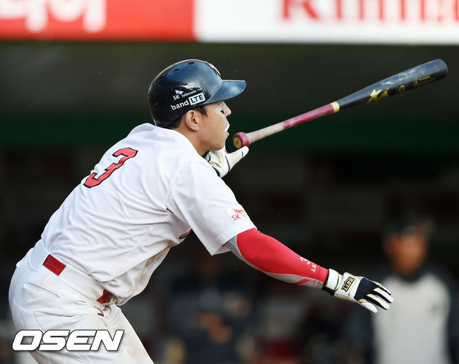 3일 오후 인천 SK행복드림구장에서 열린 '2015 타이어뱅크 KBO 리그' SK 와이번스가 NC 다이노스와의 경기, 8회말 1사 SK 나주환이 좌월 역전 솔로 홈런을 날리고 있다.