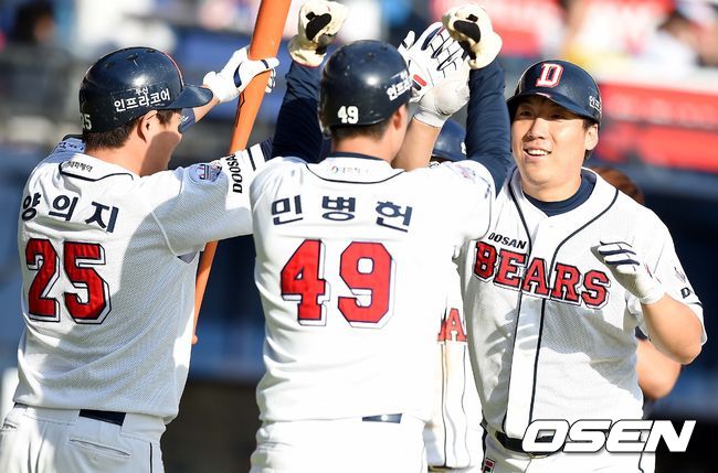 6회말 두산 공격 1사 1, 2루 상황 김현수가 스리런포를 날리고 양의지-민병헌과 인사를 나누고 있다.