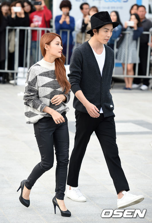 배우 박규리, 김재욱이 입장하며 팬들에게 인사를 하고 있다.