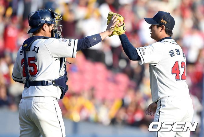 9회초 마운드에 올라 경기를 마무리지은 두산 투수 윤명준과 포수 양의지가 인사를 나누고 있다. /dreamer@osen.co.kr