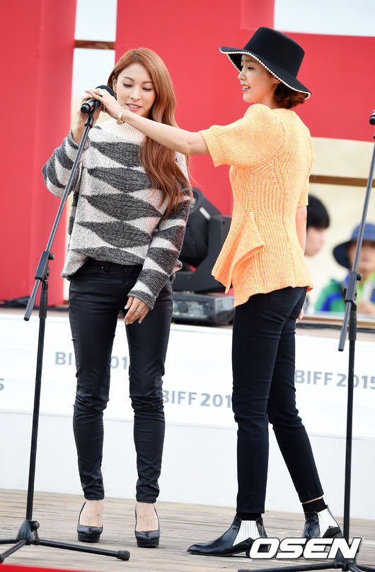 배우 채정안이 박규리의 마이크 높이를 내려주고 있다.