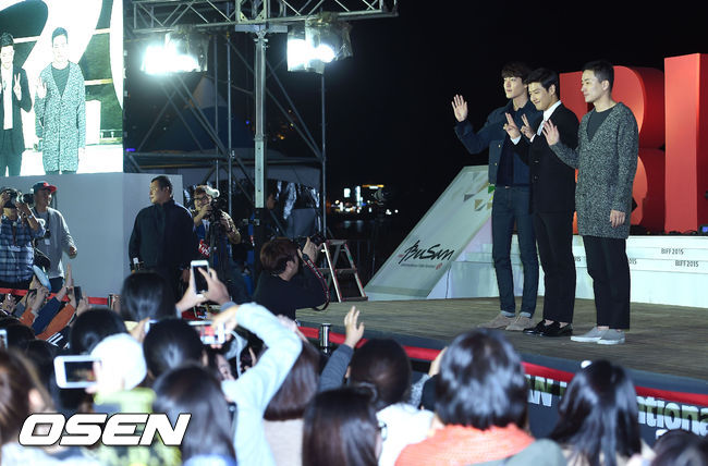4일 오후 부산 해운대 BIFF 빌리지에서 열린 영화 '스물' 야외무대인사에서 김우빈 강하늘 이병헌감독이 포토타임을 하고 있다.
