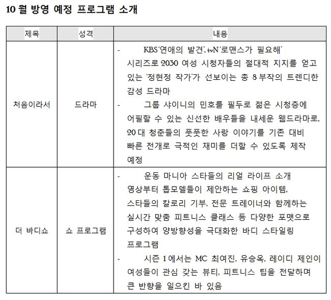 CJ E&M은 5일 양사가 공동 투자하기로 한 5개 프로그램 중 첫 작품인 드라마 '처음이라서'의 제작발표회를 가졌다. 이미 지난 8월 하반기 CJ E&M이 제작 예정인 총 5편의 프로그램에 대해 50%씩 공동 투자키로 계약을 체결한 바 있는 양사는 10월 7일 첫 방영되는 온스타일의 오리지널 드라마 '처음이라서'와 10일부터 연이어 방송되는 2030 여성 시청자들을 겨냥한 바디 스타일링 프로그램 '더 바디쇼' 론칭을 포함해 올해 연말까지 양사가 공동제작한 다양한 장르의 콘텐츠 5편을 모두 방영할 예정이다.