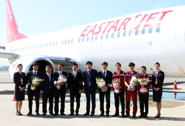 [사진] 5일 오후 강서구 김포국제공항 계류장에서 김정식 이스타항공 대표(좌측에서 다섯 번째) 및 임직원들이 신규 항공기 도입을 축하하며, 승무원과 정비사들에게 꽃다발은 전달했다. / 이스타항공 제공