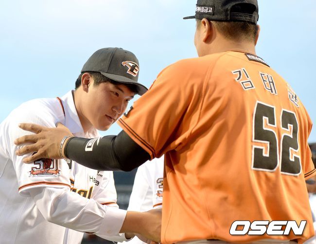 경희대 내야수 김주현(22)은 지난달 30일 한화의 시즌 마지막 홈경기를 앞두고 입단식과 함께 상견례를 가졌다. 경기 전 팬들에게 인사하는 자리에서 주장 김태균이 직접 그에게 축하의 꽃다발을 전달, 악수와 함께 등을 두드려줬다. 2016년 한화 1차 지명 신인 김주현에게는 가슴이 벅찬 순간이었다.