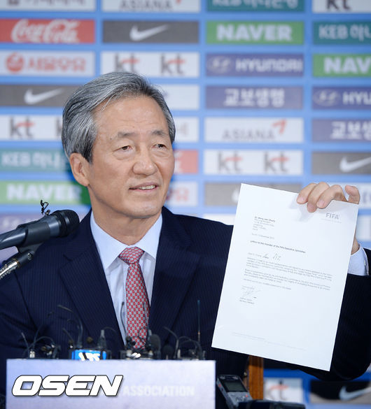 정 명예부회장은 "FIFA 윤리위원회가 보내온 진술서에 따르면 블래터 회장과 발케 사무총장은 '깜짝 놀랐다'면서 몰랐던 것처럼 너스레를 떨었다. 이 사람들은 기억상실증 환자다"면서 "지난 8월 해당 정보가 흘러나올 때 FIFA 감찰위원회에 조사를 요청했고, 한 달여 만에 감찰위원회는 증거가 없다면서 사건을 종결지었다"며 결백을 주장했다. /sportsher@osen.co.kr