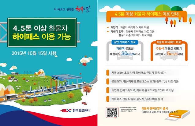6일 국토교통부는 운행제한 차량 단속 등으로 하이패스 이용이 제한됐던 4.5톤 이상 화물차도 10월 15일부터는 고속도로 하이패스를 이용할 수 있다고 밝혔다.
