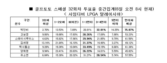 또, 박인비 외에도 3번으로 지정된 스테이시루이스(61.58%)와 5번 렉시톰슨(61.34%), 7번 유소연(57.55%), 2번 고보경(53.23%)등이 과반수의 언더파 투표율을 넘으며 1라운드에 준수한 활약을 할 것으로 예측됐다.