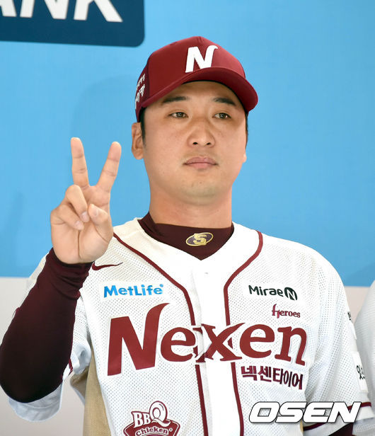 6일 오후 목동구장에서 열린 '2015 타이어뱅크 KBO 와일드카드 결정전 미디어데이에서 이택근이 점수차 예상을 손가락으로 표시하고 있다.