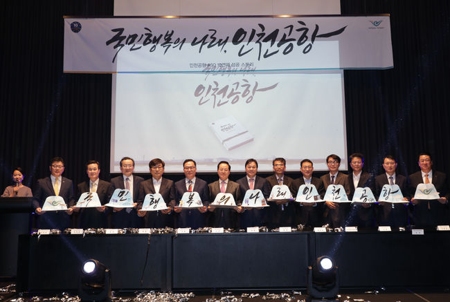 [사진] 6일 인천시 중구 네스트호텔에서 열린 '국민행복의 나래, 인천공항' 발간기념회에서 박완수 인천공항공사 사장(오른쪽에서 7번째), 김수곤 서울지방항공청장(오른쪽에서 6번째)과 인천공항 상주기관장들이 출판을 축하하는 퍼포먼스를 하고 있다. / 인천공항 제공