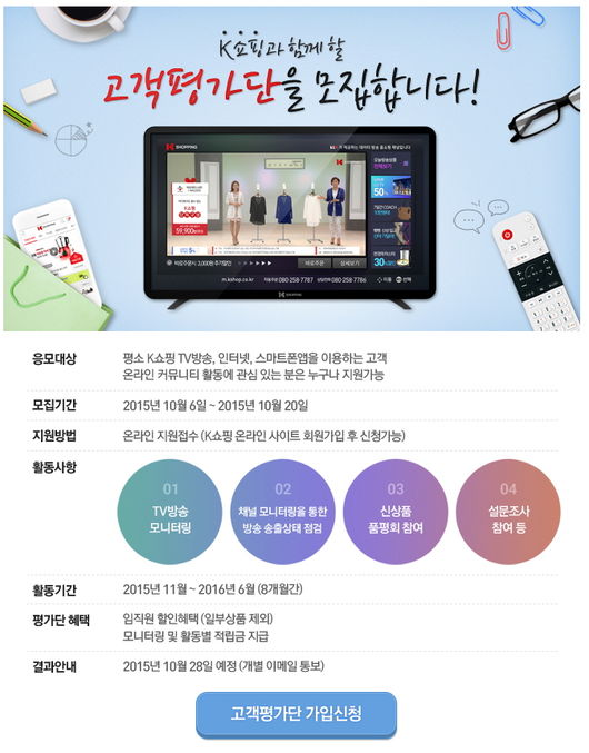 K쇼핑 고객평가단은 올해 11월부터 내년 6월까지 총 8개월간 TV방송 모니터링, 서비스 의견 제안, 신상품 품평회 참여, 설문조사 참여 등의 다양한 활동을 하게 된다.