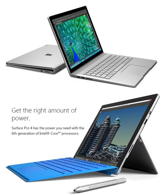 [사진] 위로부터 서피스북, 서피스 프로4, 루미아 950(왼쪽), 950XL(오른쪽). / 마이크로소프트 홈페이지 캡처.