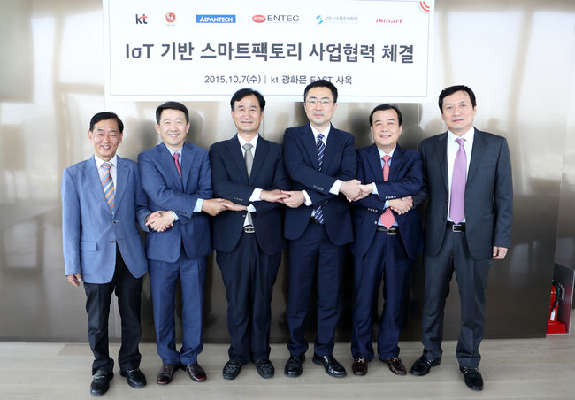 [사진] 왼쪽부터 iSmart 최문기 대표이사, 인텍전기전자 김웅회 전무이사, 교동식품 김병국 대표이사, KT 미래융합사업추진실 유용규 상무, 어드밴텍케이알 정준교 지사장, 선진시스템 서선택 대표이사 / KT 제공