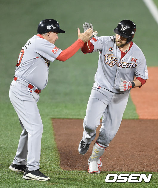 7일 오후 서울 목동구장에서 '2015 타이어뱅크 KBO 리그' 넥센 히어로즈와 SK 와이번스의 와일드카드 결정 1차전, 5회초 무사에서 SK 브라운이 동점 솔로포를 날리고 알바레즈 코치와 기뻐하고 있다.